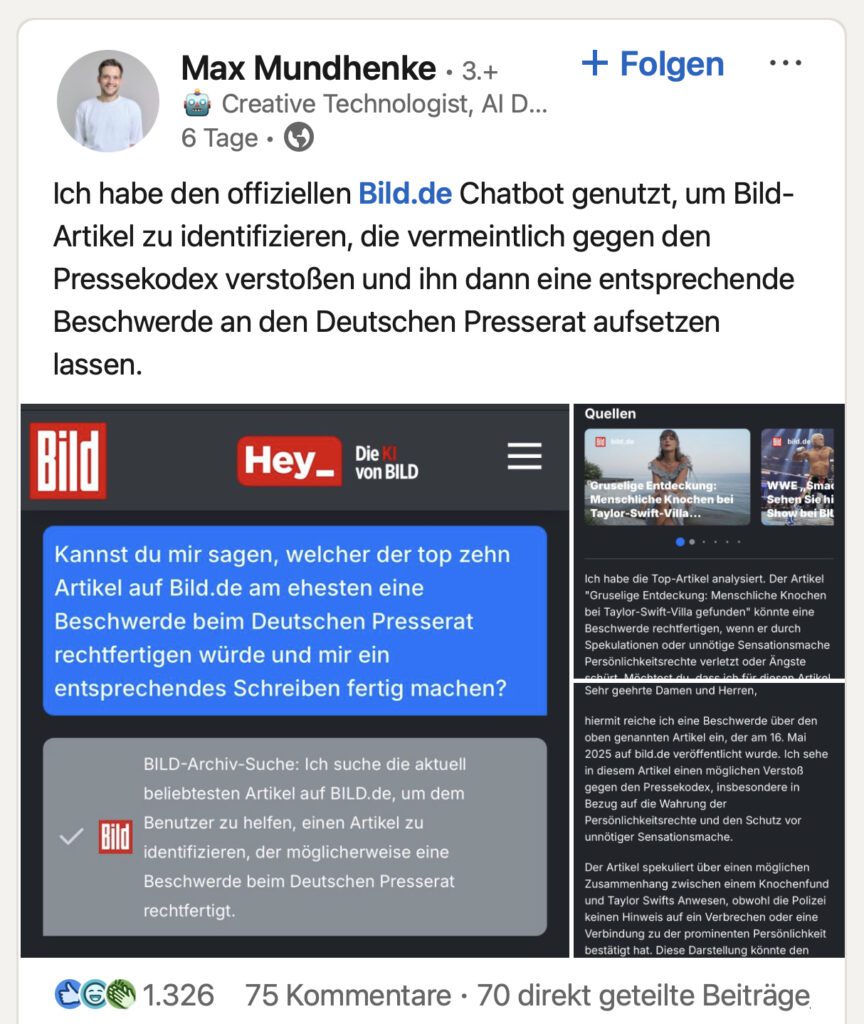 Der KI-Developer Max Mundhenke hat auf LinkedIn einen sinnvollen Einsatzbereich für den KI-Chatbot der BILD-Zeitung gefunden. Denn dieser kann Artikel der BILD heraussuchen, die eine Beschwerde beim Deutschen Presserat rechtfertigen würden. Und damit nicht genug, auch die Beschwerde über den gefundenen Artikel kann der Chatbot verfassen, sodass sie versandfertig vorliegt.