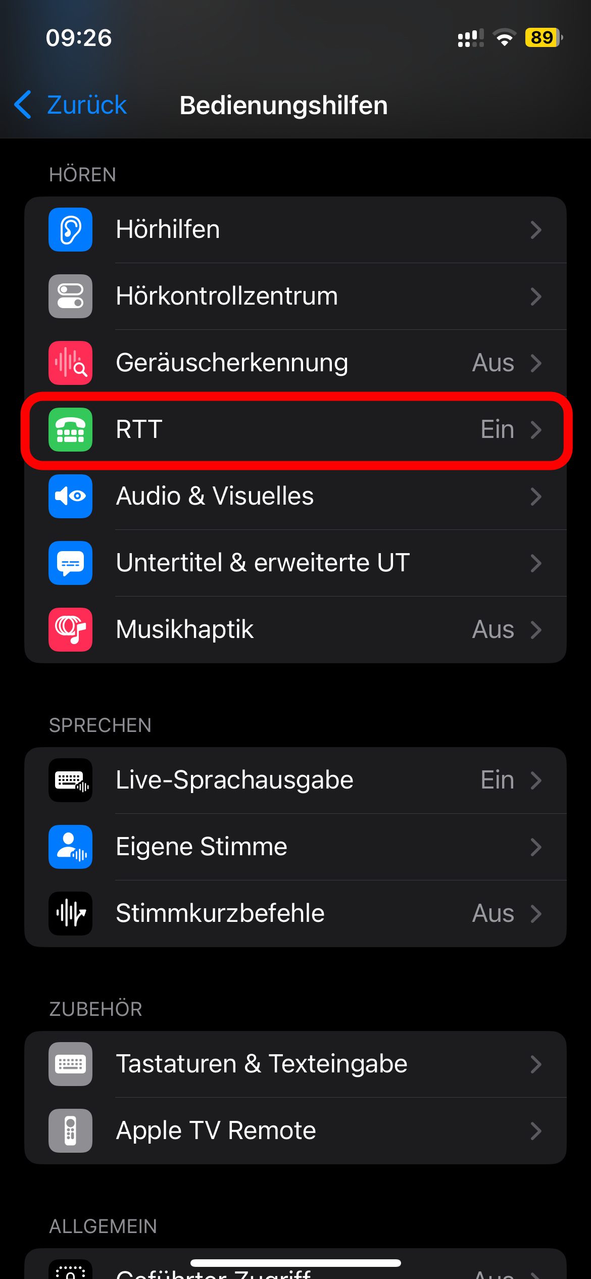 Am iPhone muss zur Nutzung unter Einstellungen -> Bedienungshilfen im Bereich „Hören“ die Option RTT aktiviert werden.