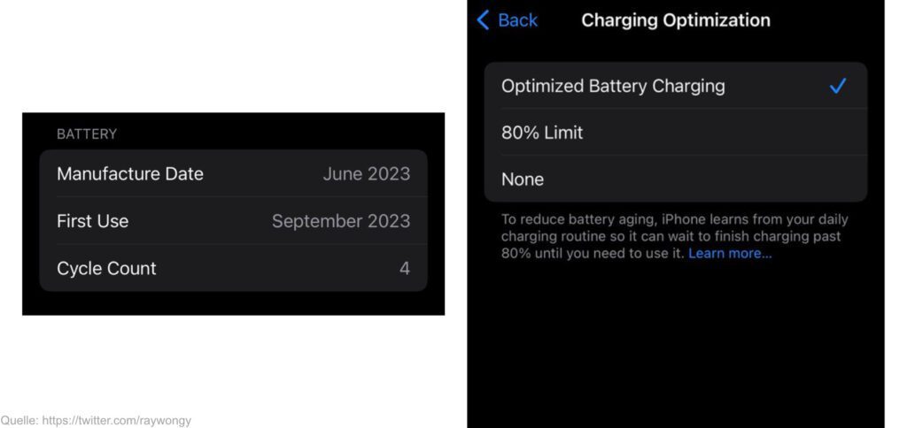 In deren Batterie-Einstellungen gibt es nun Informationen zum Herstellungsdatum, zum Zeitpunkt der ersten Nutzung und zu den Ladezyklen. Zudem kann neben dem optimierten Aufladen auch ein Limit von 80% eingestellt werden. Ein Ignorieren von Ladeverzögerung und Ladestopp lassen sich aber weiterhin auswählen, wenn mal explizit 100% Akkuladung benötigt werden. (Quellen: 1, 2)