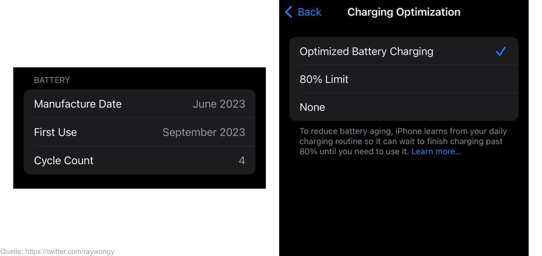 In deren Batterie-Einstellungen gibt es nun Informationen zum Herstellungsdatum, zum Zeitpunkt der ersten Nutzung und zu den Ladezyklen. Zudem kann neben dem optimierten Aufladen auch ein Limit von 80% eingestellt werden. Ein Ignorieren von Ladeverzögerung und Ladestopp lassen sich aber weiterhin auswählen, wenn mal explizit 100% Akkuladung benötigt werden. (Quellen: 1, 2)