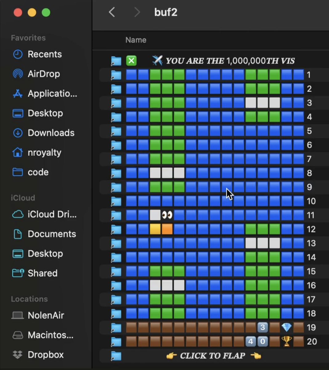 Und zum Schluss mal wieder etwas Spielerisches: Der für unkonventionelle Spielkonzepte auf dafür nicht gemachten Plattformen bekannte Entwickler Nolen Royalty (Pseudonym „eieio“) hat das aus 2013 stammende Kultspiel „Flappy Bird“ im macOS-Finder realisieren können. Dafür hat er sich die Möglichkeit, in Verzeichnis-Namen Emojis unterbringen zu können, sowie einer Python- und AppleScript-Bastelei bedient.