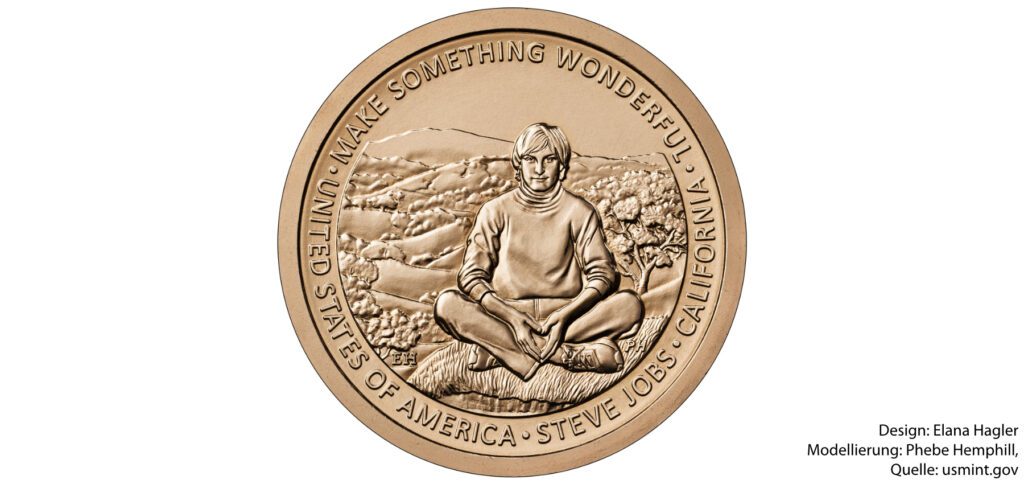 Die Münze mit der Steve Jobs Prägung zeigt den Apple-Cogründer in jungen Jahren mit halblangen Haaren, Rollkragenpullover, Jeans und Sportschuhen auf einer Wiese im Schneidersitz sitzend. Hinter ihm sind für Kalifornien typische Hügel und Bäume zu sehen. Um das Motiv herum steht: „Make something wonderful. United States of America. Steve Jobs. California.“
