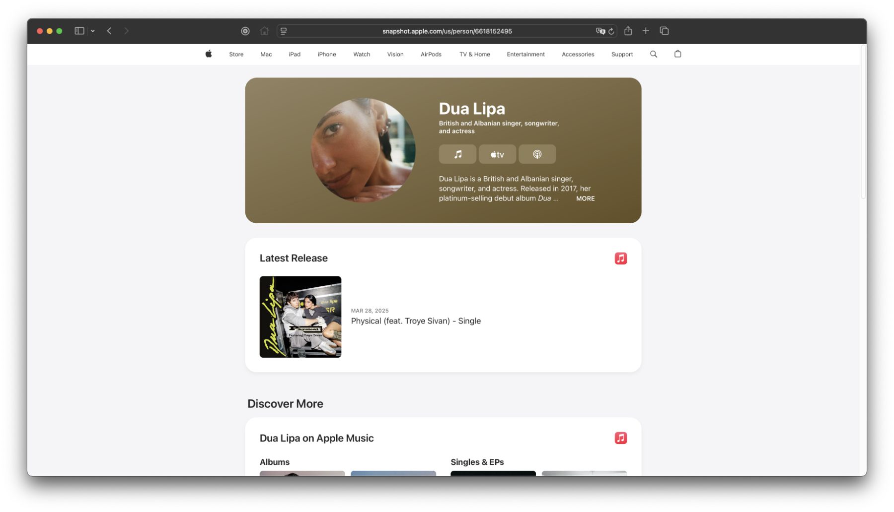 Die einzelnen Star-Profile bieten Links zu Apple-Angeboten