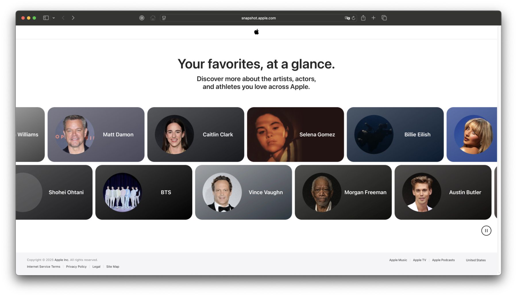 Auf zwei virtuellen Fließbändern laufen die verschiedenen Namen und Fotos von Prominenten auf https://snapshot.apple.com/ von rechts nach links über den Bildschirm. Darüber findet man den Text „Your favorites, at a glance. Discover more about the artists, actors, and athletes you love across Apple.“ (Deine Lieblinge, auf einen Blick. Entdecke mehr zu den Künstler/innen, Schauspieler/innen und Athlet/innen, die du liebst, bei Apple.).