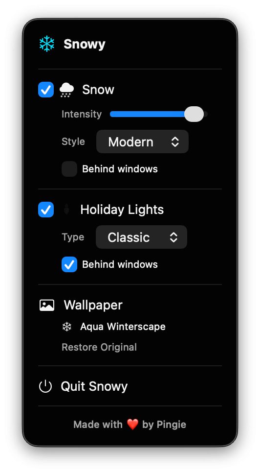 Nach der Installation der Snowy App kann diese aus der Menüleiste heraus genutzt werden. Es gibt kein störendes Dock-Icon. In dem Ausklapp-Menü der App können der Schneefall aktiviert und dessen Deckkraft eingestellt werden. Zudem lässt sich die Lichterkette ein- und ausschalten, nebst einigen Gestaltungsoptionen. Unter Wallpaper kann der „Aqua Winterspace“-Schreibtischhintergrund eingeschaltet werden.