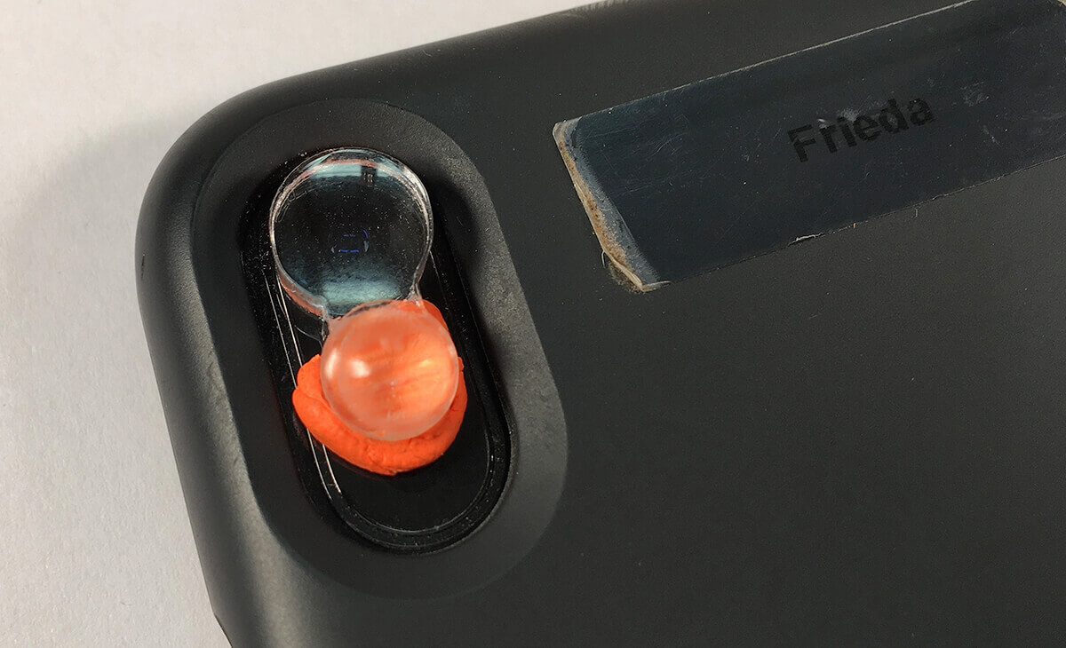 Durch die unkonventionelle Befestigung mit einem kleinen Knetklumpen und dank ihrer kleinen Bauweise lässt sich die Snugle-Linse mit jeder iPhone-Schutzhülle verwenden – oder auch ganz ohne Hülle.