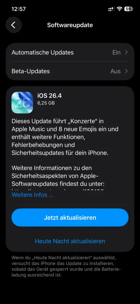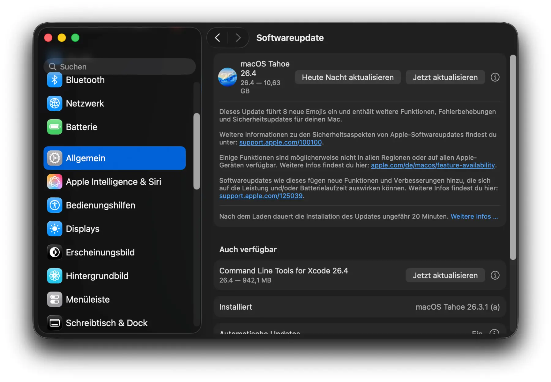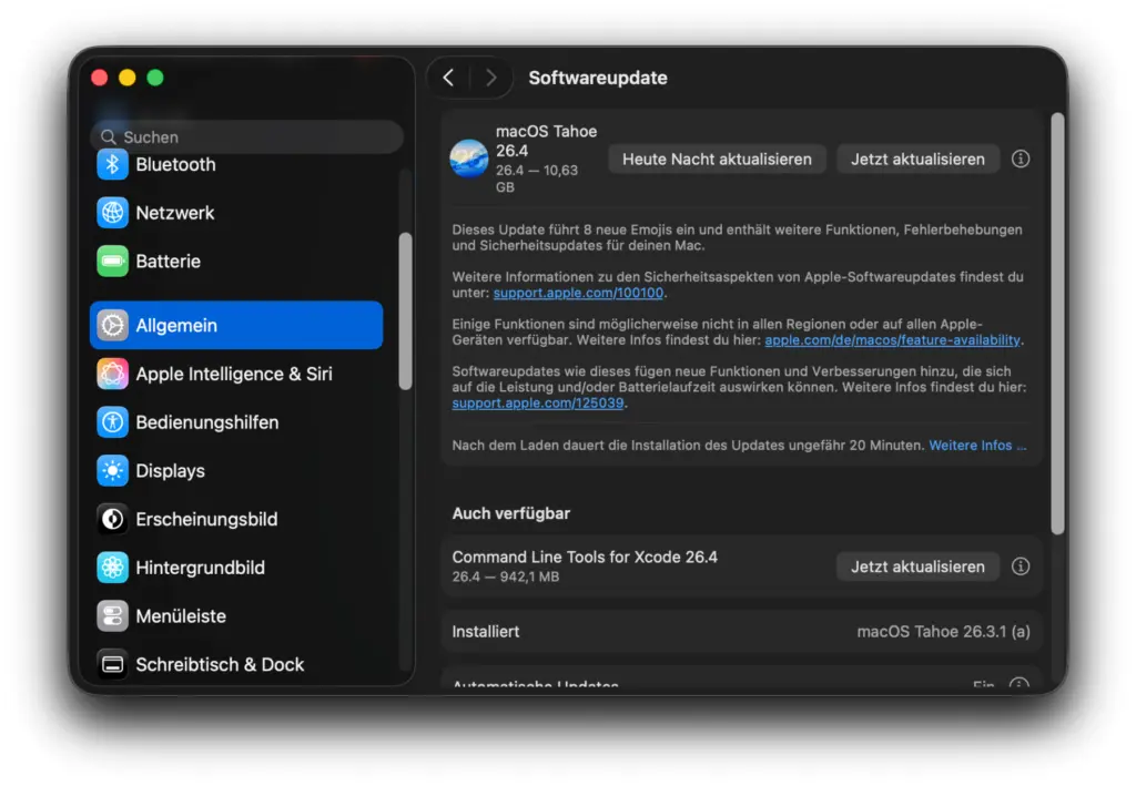 Am iPad kann man unter iPadOS 26.4 die gleichen Anpassungen erwarten. Am Mac werden von Apple lediglich die acht neuen Emojis hervorgehoben. Dann geht es unter Systemeinstellungen -> Allgemein -> Softwareupdate vor allem darum, dass macOS 26.4 mehrere Sicherheitsaspekte enthält. Dieses sowie alle anderen 26.4-Updates schließen also mehrere Sicherheitslücken.