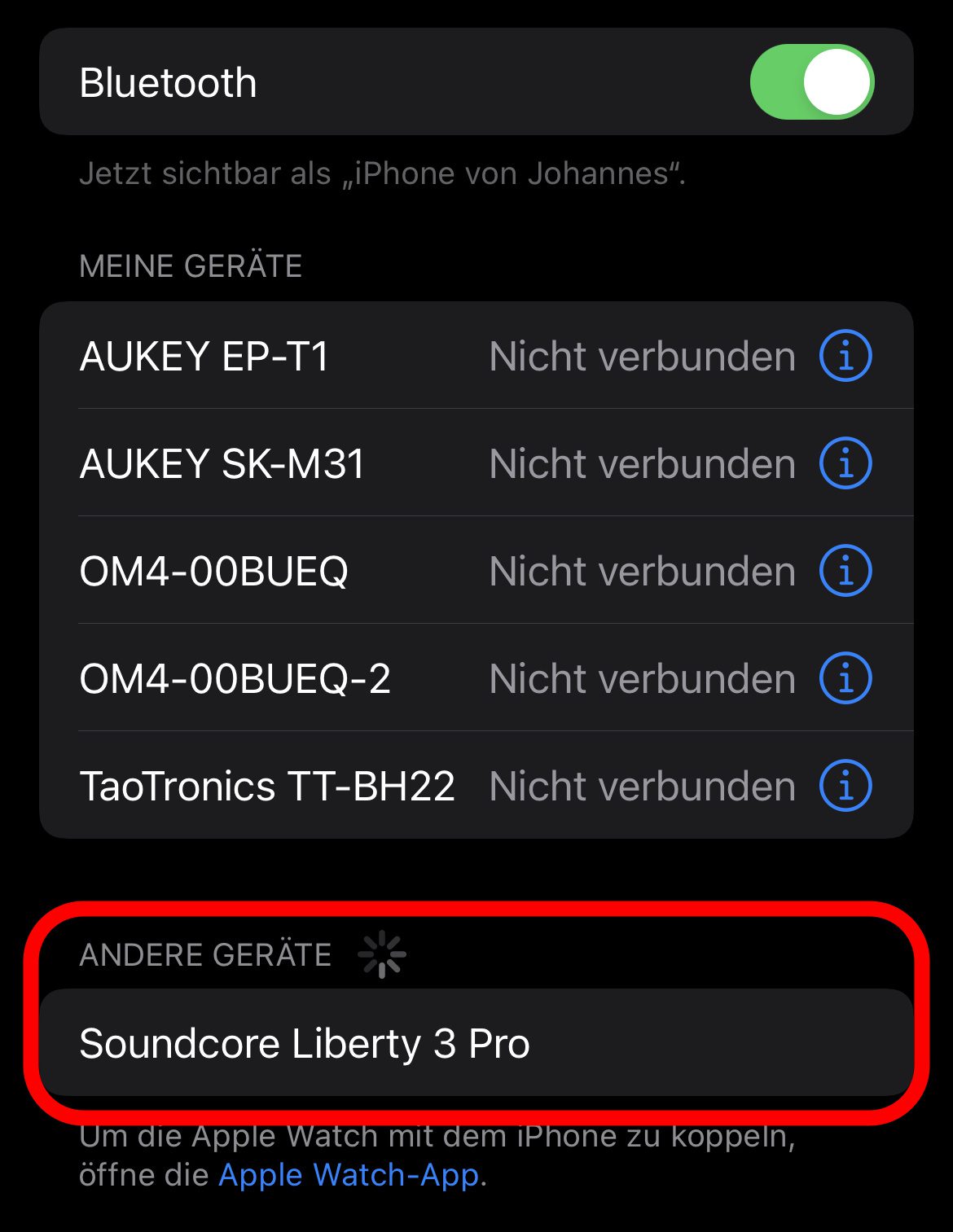 Das Pairing, also das Koppeln mit Audio-Quellen, hat im Test sehr gut funktioniert. Befinden sich die Soundcore Liberty 3 Pro Earbuds im Ladecase, dann öffnet man dieses einfach. Ein Blinken von zwei weißen LED-Lichtern zeigt an, dass das Pairing läuft. Koppelt man die Kopfhörer das erste Mal mit einem Gerät, muss man auf diesem die Kopfhörer aus der Geräte-Liste auswählen und antippen oder anklicken. Das hat bei mir sowohl am iPhone als auch am MacBook ohne Weiteres funktioniert.