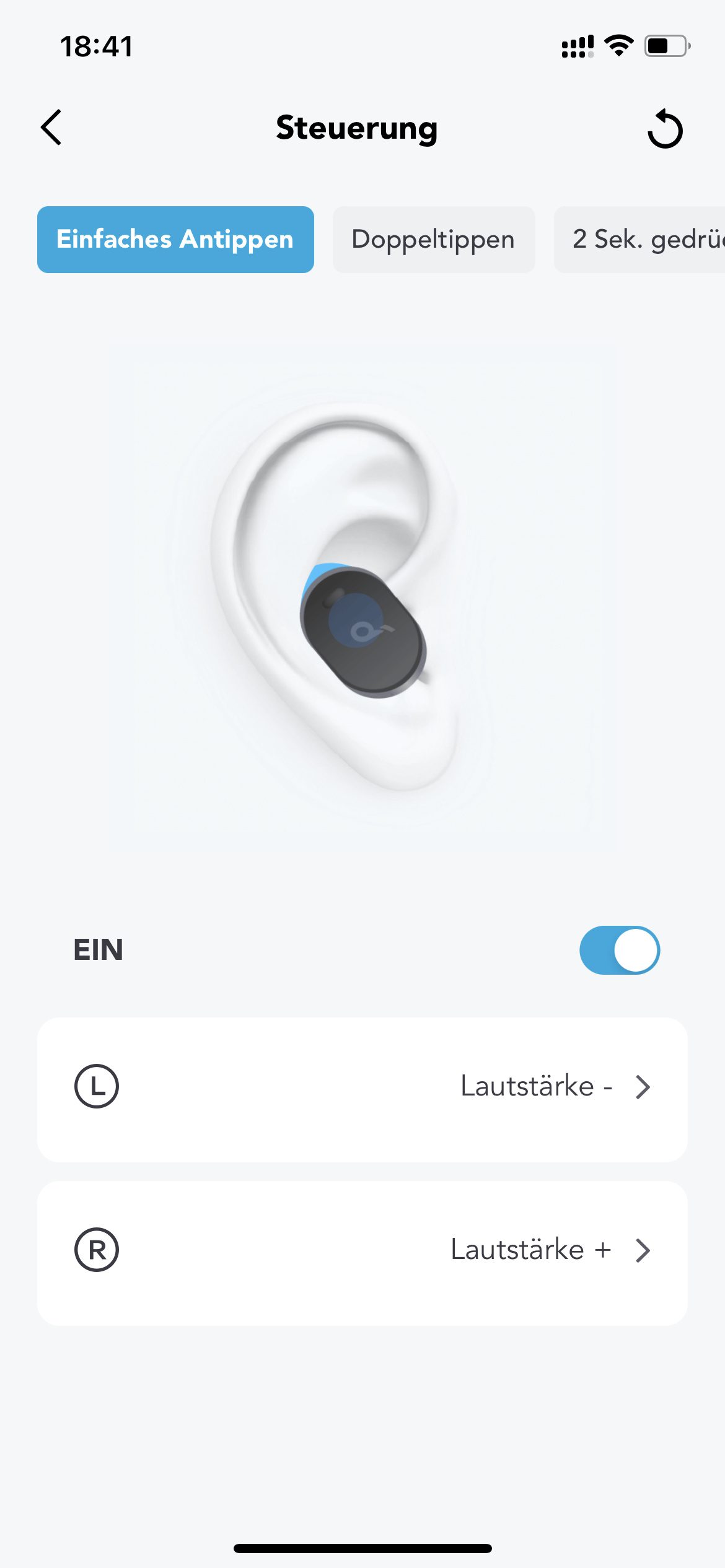 - Links oder rechts 2 Sekunden halten: ANC (de)aktivieren bzw. Transparenzmodus (de)aktivieren