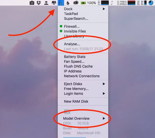 Meine Empfehlung für die Fehlersuche ist daher das Tool FastTasks 2, das nach dem Start erstmal fast unsichtbar in der obere Finder-Menüzeile residiert. Klickt man dort auf das "F2"-Symbol, klappt ein recht umfangreiches Menü auf, über das man diverse Analysen und Information ansehen kann oder auch Systemeinstellungen ändern kann. Das meiste davon ist aus meiner Sicht für die Fehlersuche nicht wichtig, aber die Menüpunkte "Analyse" und "Model Overview" sind für uns relevant.