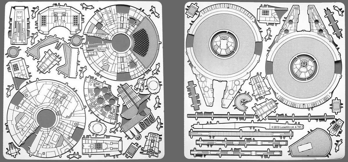 Das Faszinierende an den Bausätzen ist, dass die Einzelteile aus einer flachen Metallplatte gelasert wurden und erst mit einem Elektronik-Seitenschneider oder einer kleinen Zange aus dieser Platte "befreit" werden müssen. Dann hat man "flache" Teile, die in einigen Fällen (wie beim Cockpit des Millennium Falcon) auch noch in passende Form gefaltet werden müssen.