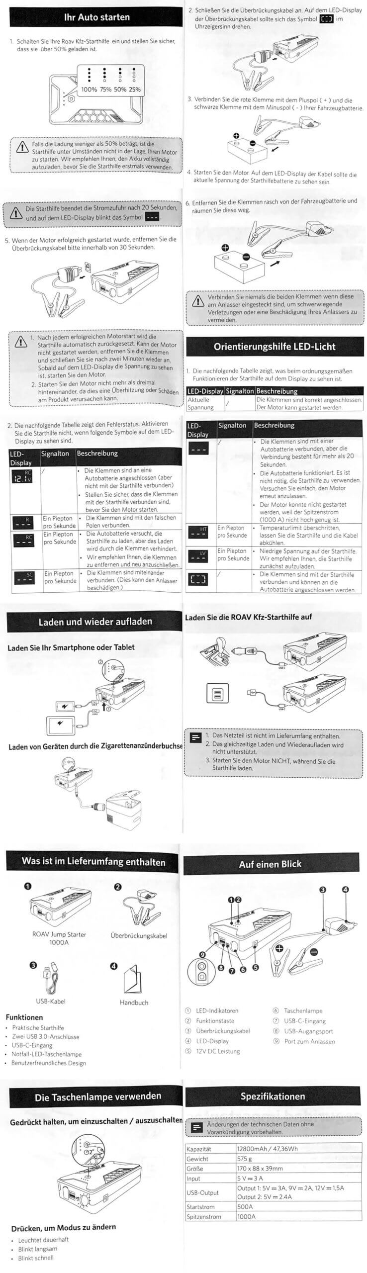Wenn ihr euch für die Anleitung zur Roav Jump Starter Pro Powerbank interessiert, in der auch die Fehlermeldungen erklärt sind, findet ihr sie hier als Fotocollage. Bitte entschuldigt die schlechte Qualität, aber ich habe sie einfach abfotografiert und in ein Bild zusammen gebaut.