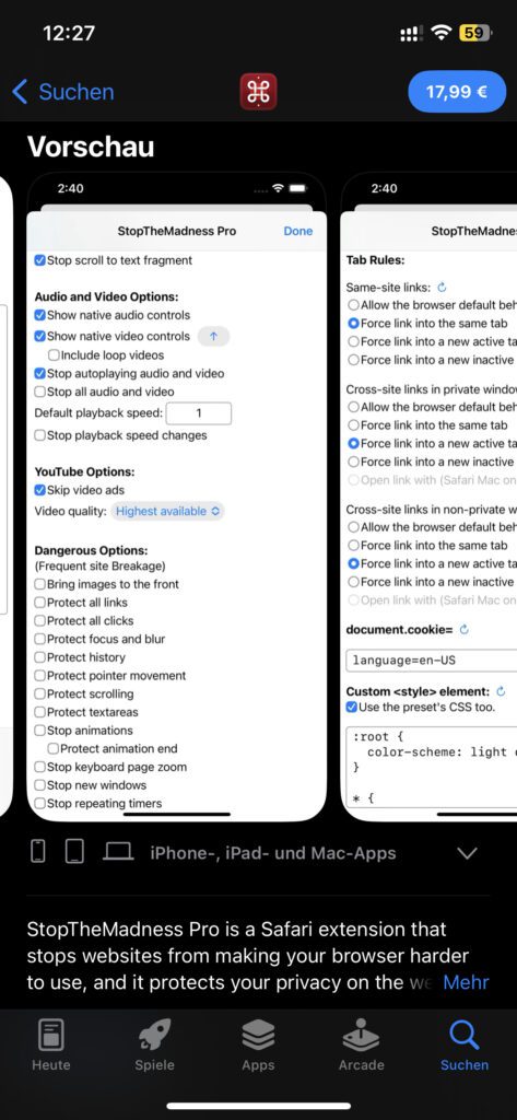 Wie ihr auf der oben verlinkten Seite des App Stores für Mac, iPhone und iPad seht, ist StopTheMadness Pro ein kostenpflichtiges Browser-Plugin. Es kostet 17,99 Euro und ist daher eher etwas für jene, die großflächig von den einzelnen Einstellungsmöglichkeiten und Features profitieren. Zum Ausprobieren und Herumspielen ist es ggf. zu teuer. Was den Preis jedoch relativiert, ist die Tatsache, dass ein einzelner Kauf die Nutzung auf mehreren Geräten – also Mac, iPhone und iPad gleichermaßen – ermöglicht.