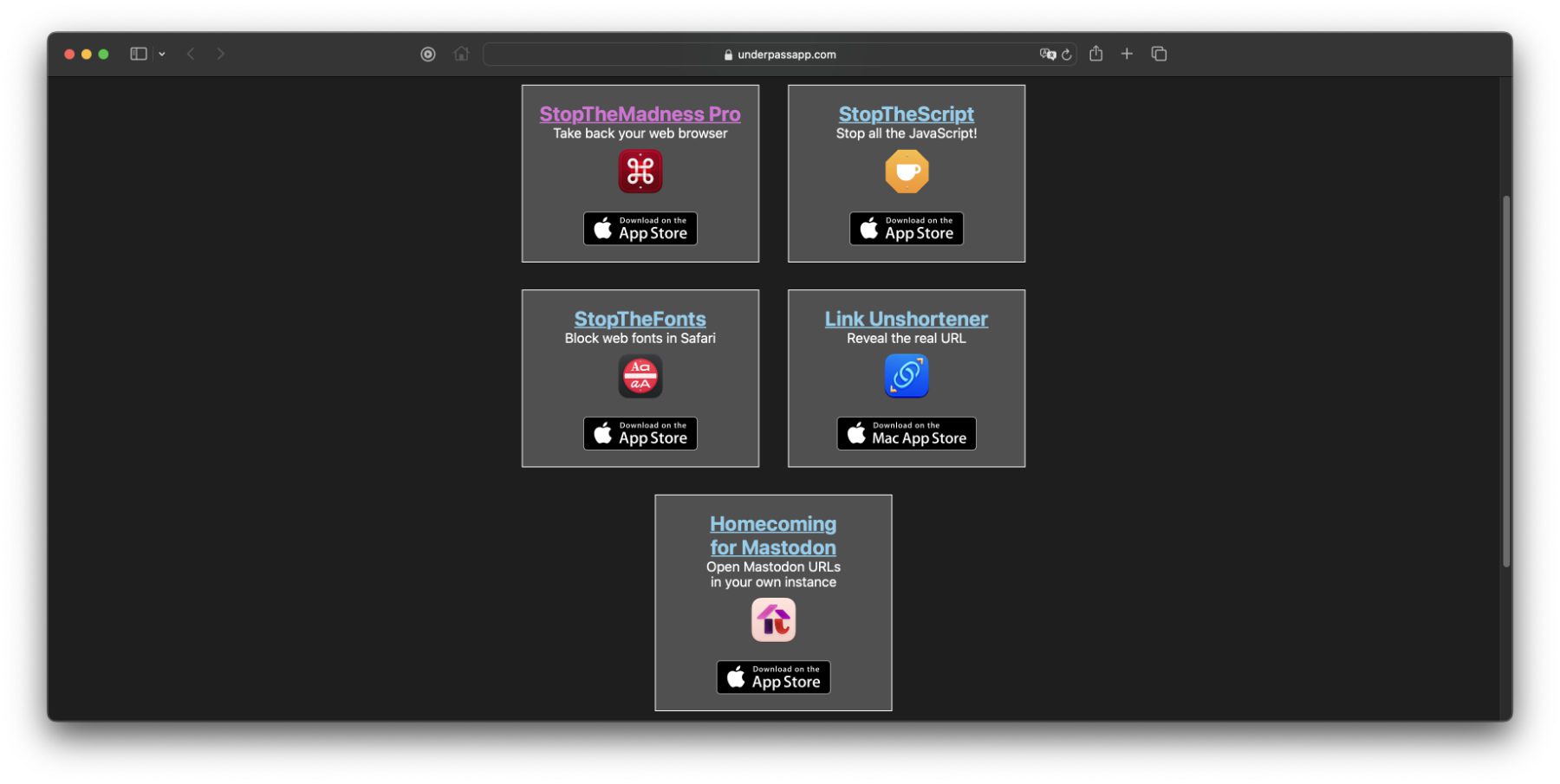 Das umfangreiche Plugin stammt aus der Softwareschmiede Underpass App Company von Jeff Johnson. Der Entwickler bietet dabei neben StopTheMadness Pro auch solche Hilfsprogramme wie StopTheScript (hält jedes JavaScript an), StopTheFonts (blockiert Web-Schriftarten in Safari), Homecoming for Mastodon (öffnet Mastodon-Links in der eigenen Instanz) und den Link Unshortener (hier bereits vorgestellt) an.