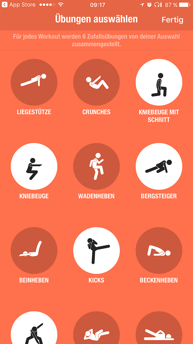 - Wenn man sein erstes Workout plant, wählt man selbst sechs Übungen aus der Liste. Wieso übernimmt das nicht die App und sucht Übungen aus, die den kompletten Körper abdecken?