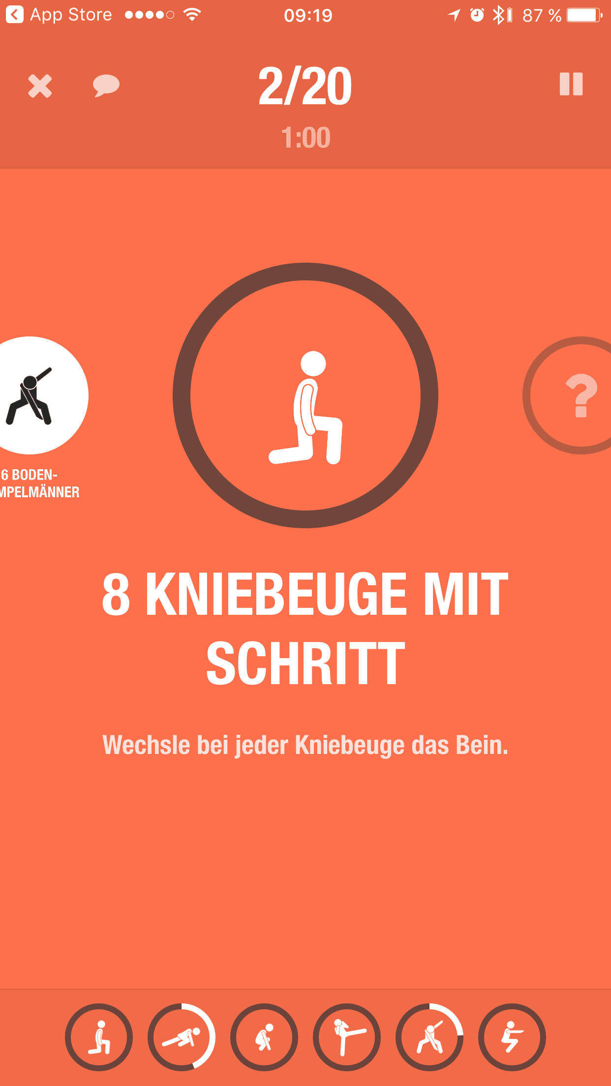 - Hat man das Workout gestartet, wählt die App zufällig die Reihenfolge der Übungen. Dabei passiert es manchmal auch, dass man zum Beispiel 2 oder 3 mal hintereinander Burpees oder andere Übungen hat. Das finde ich ungünstig und vermeidbar.