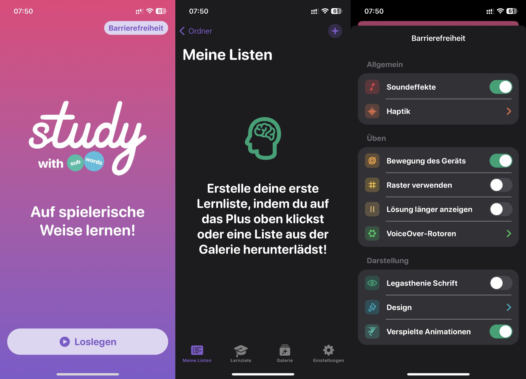 Dank der verschiedenen Einstellungen für die Barrierefreiheit kann die Lernfunktion von Study with Subwords aber auch individuell angepasst werden. Sie ist durch VoiceOver / Switch Control und Sprachsteuerung zugänglich und bietet die Unterstützung für große Schrift. Außerdem kann eine spezielle Schriftart aktiviert werden, welche die Inhalte für Menschen mit Legasthenie leichter lesbar macht. Der Wechsel von einem Gravitations-Lernspiel auf ein Raster-Layout ist ebenfalls möglich, um das Auffinden von Teilwörtern zu erleichtern und die kognitive Belastung beim Lernen abzumildern.