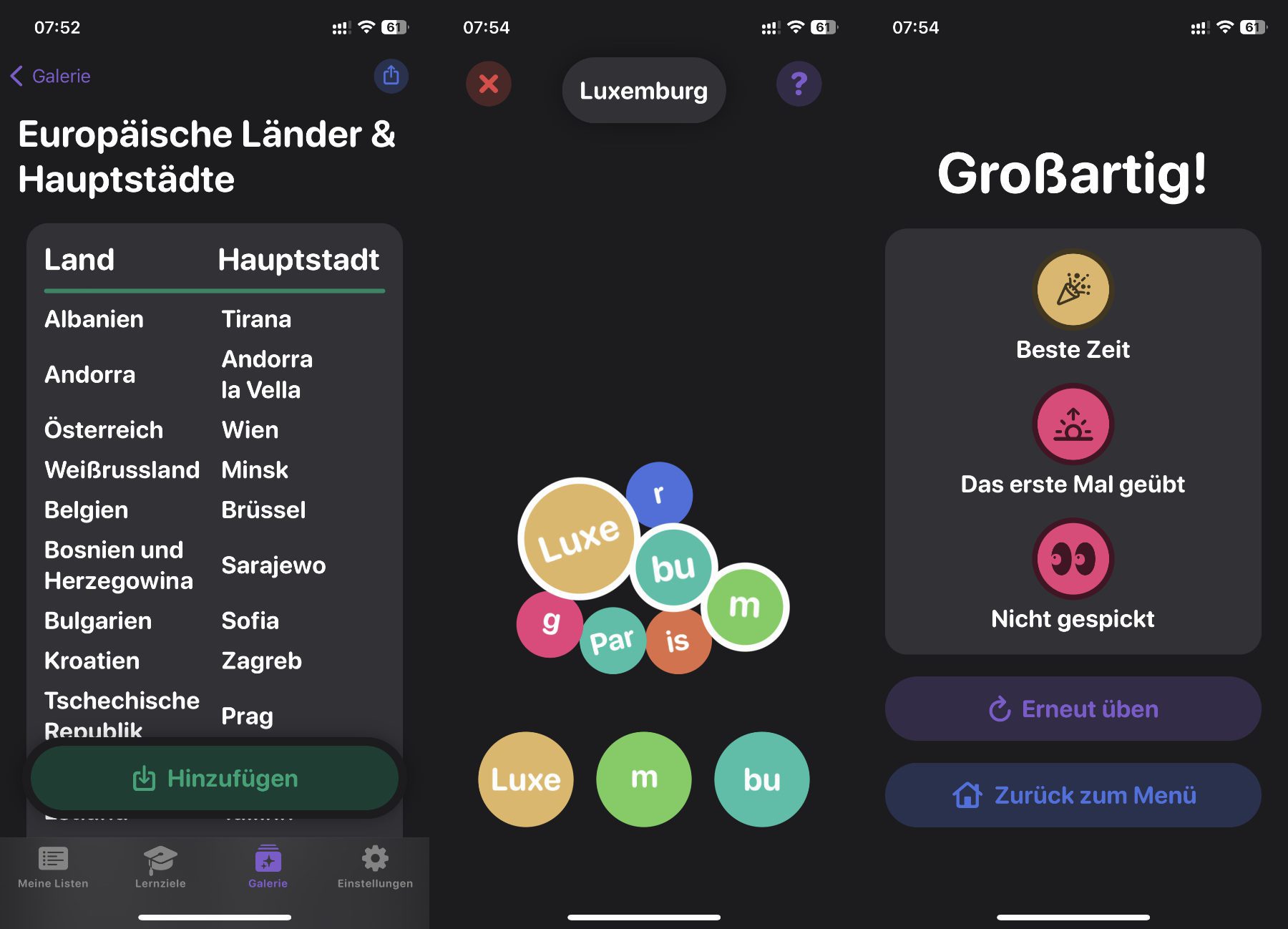 Nach dem ersten Öffnen der App kann man bereits viele Sachen ausprobieren. Ich habe mir zum Beispiel ein paar Hauptstädte-Listen aus der kostenlosen Galerie geladen und bereits die ersten Lernrunden absolviert. Zudem habe ich die Legasthenie-Schrift und die Raster-Ansicht ausprobiert. Beides finde ich ebenso gelungen wie das Spiel mit der voreingestellten Schrift und den herunterfallenden Teilwort-Kreisen. Ein paar der oben aufgelisteten Funktionen sind in der kostenlosen Version aber nicht verfügbar. Zum Beispiel stehen nicht alle Listen der Galerie zum Download bereit.