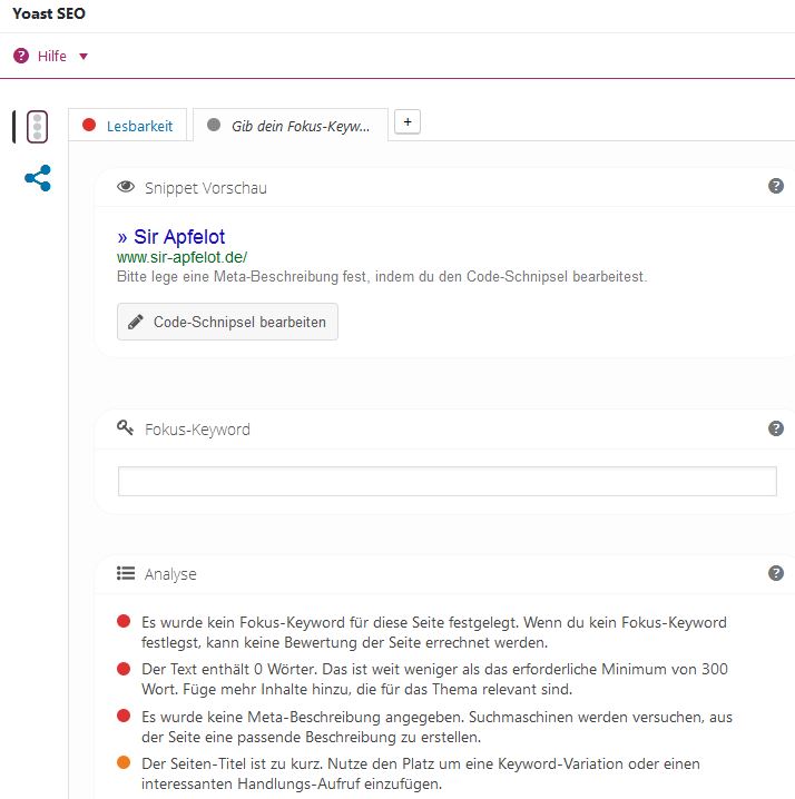 Ein Beispiel wäre das Yoast SEO Plugin für WordPress, welches auch für Sir-Apfelot.de zum Einsatz kommt. In dieses Plugin gebt ihr einfach das Keyword ein, das für den Artikel und somit auch für Google am wichtigsten ist. Dann wird euch mit Rot, Orange und Grün die Optimierung für Suchmaschinenanfragen aufgezeigt. Bei möglichen Verbesserungen kommen Rot und Orange zum Einsatz. Falls ein Punkt (Keyword-Dichte, Anwendung des Worts in Überschriften, Gesamtwortanzahl, …) stimmt, dann wird der Punkt davor grün.