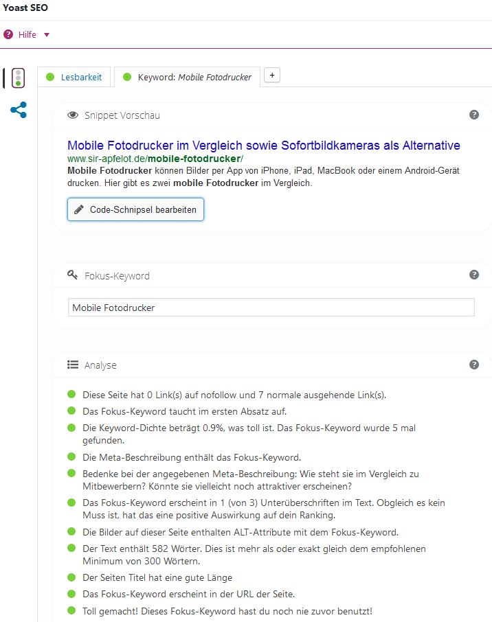 Und so sieht das Yoast SEO Plugin beispielsweise für diesen Artikel aus: