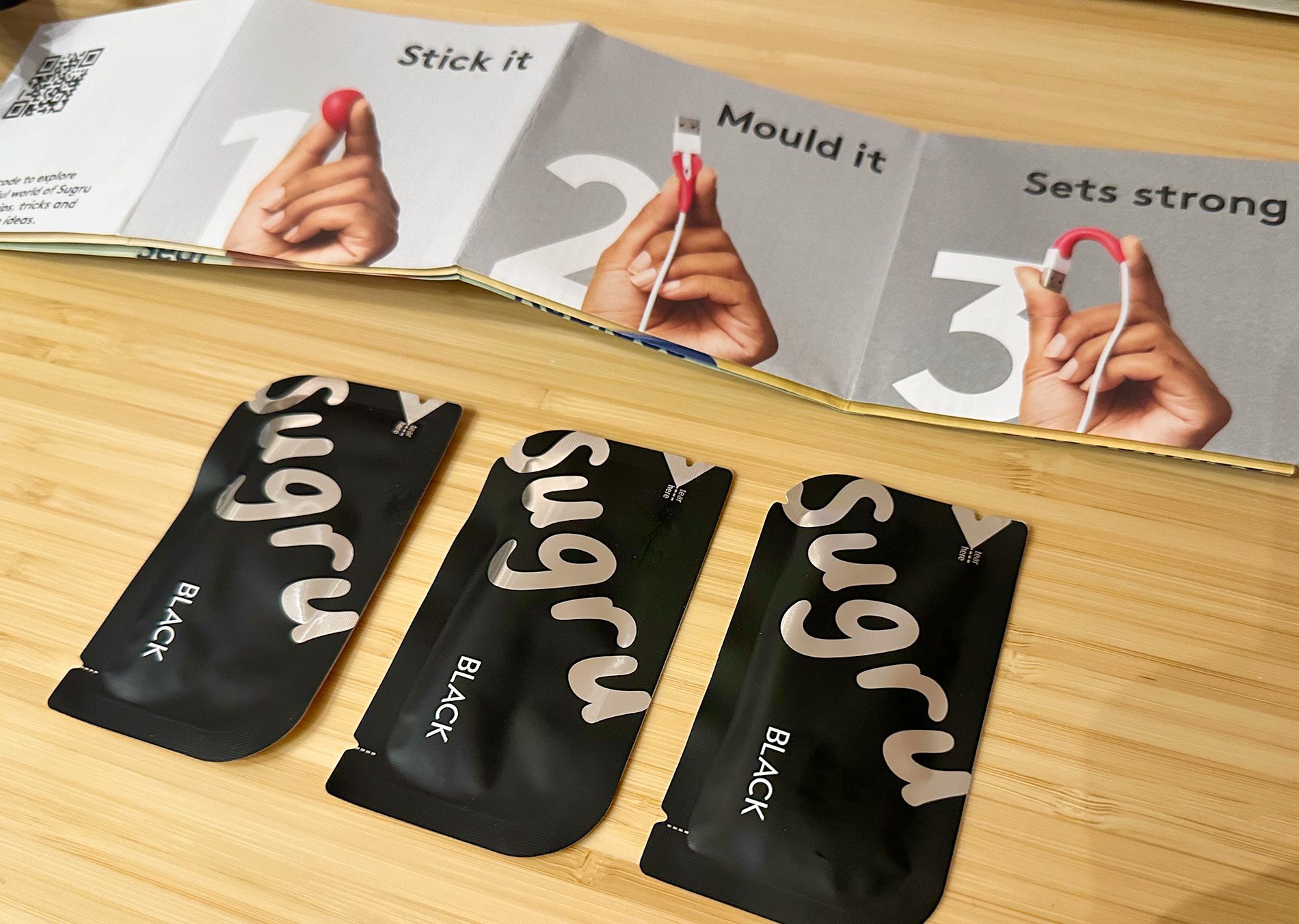 - angebrochenes Sugru kann man nicht aufheben – es härtet schnell aus, egal, wie gut man es verpackt