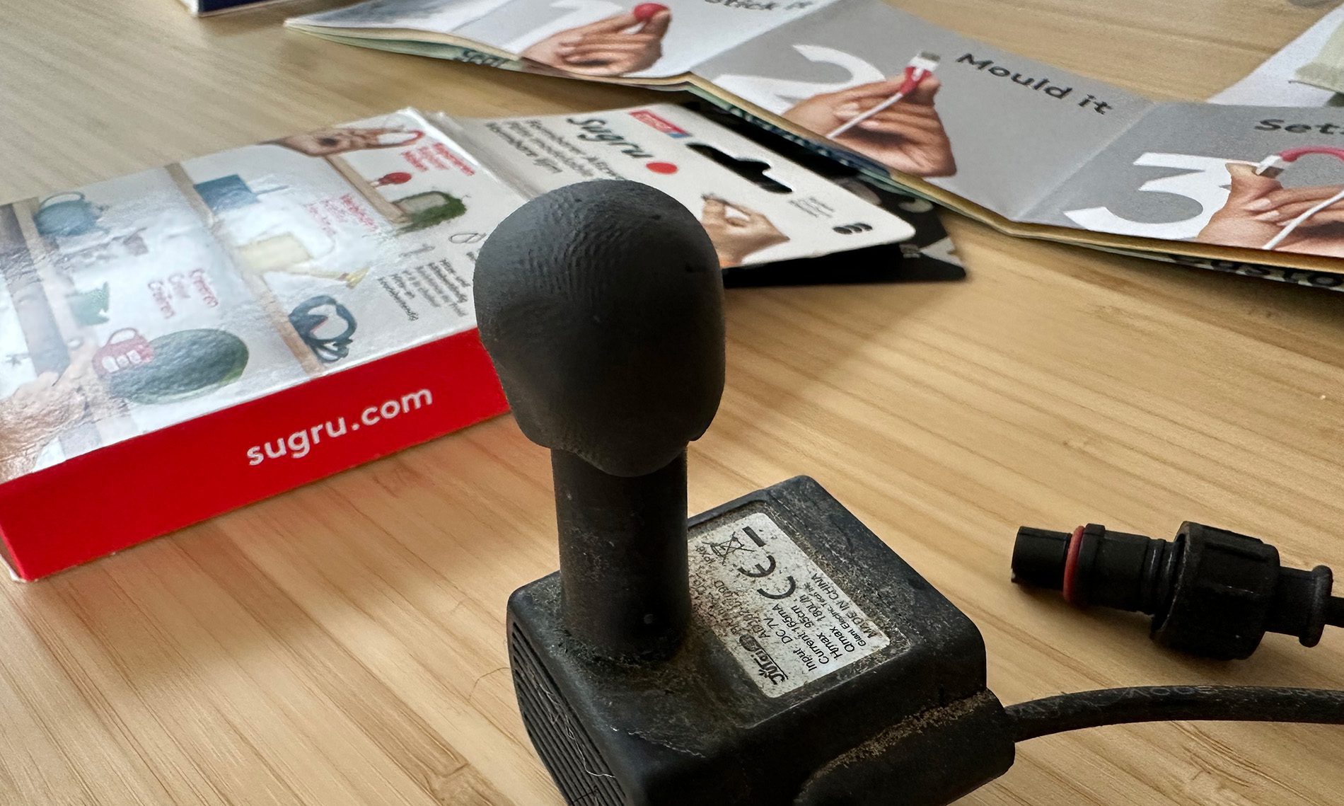 Ich war schon kurz davor, meinen neuen Brunnen zu bestellen und den alten zu entsorgen, da fiel mir Sugru ein. Mit dem Silikon-Gummi kann ich natürlich keinen formvollendeten Aufsatz mit 20 Düsen basteln, aber ein einfacher Aufsatz mit einem Loch ist schnell erledigt.