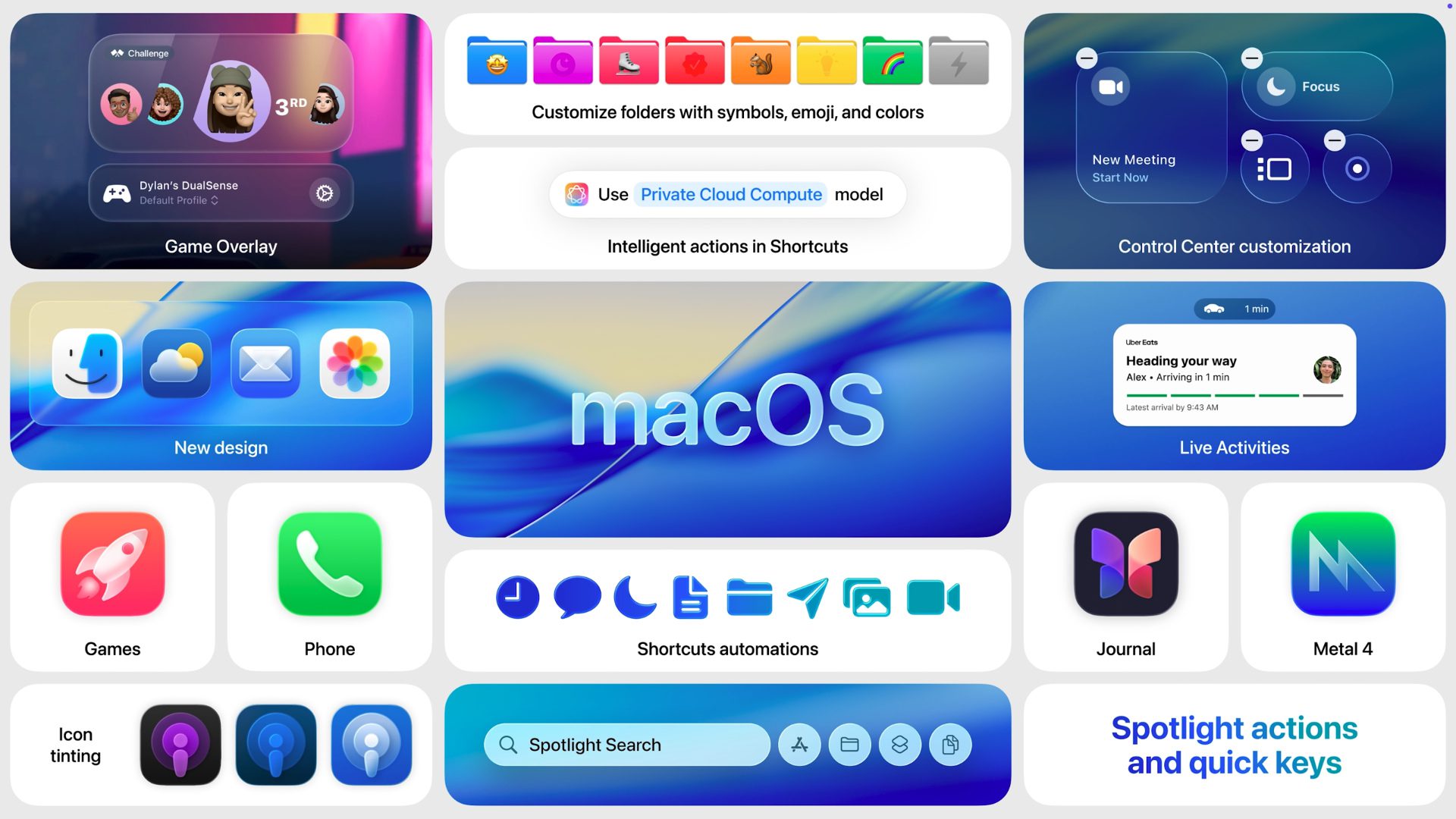 - Games App: Die neue Games App steht wie in iOS 26 und iPadOS 26 auch unter macOS 26 zur Verfügung. Sie bringt innerhalb von laufenden Spielen zudem ein Overlay, das den Zugriff auf die wichtigsten Spiele-Einstellungen sowie die Kommunikation mit Kontakten ermöglicht. Für das Gaming am Mac kommt zudem ab macOS 26 das Grafik-Framework Metal 4 zum Einsatz.