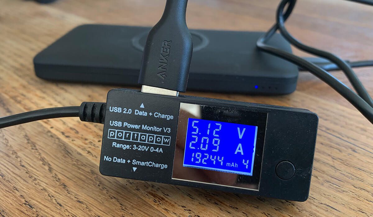 Mit einem USB-Lastwiderstand habe ich noch gemessen, wann die Powerbank die maximale Ausgangsleistung erreicht hat und abschaltet. Dies war bei ca. 2,5 Ampere und 4,9 Volt erreicht. Das entspricht etwa 12 Watt Leistung. Als ich noch mehr abrufen wollte, hat die PowerCore 10K Wireless die Schotten dicht gemacht.