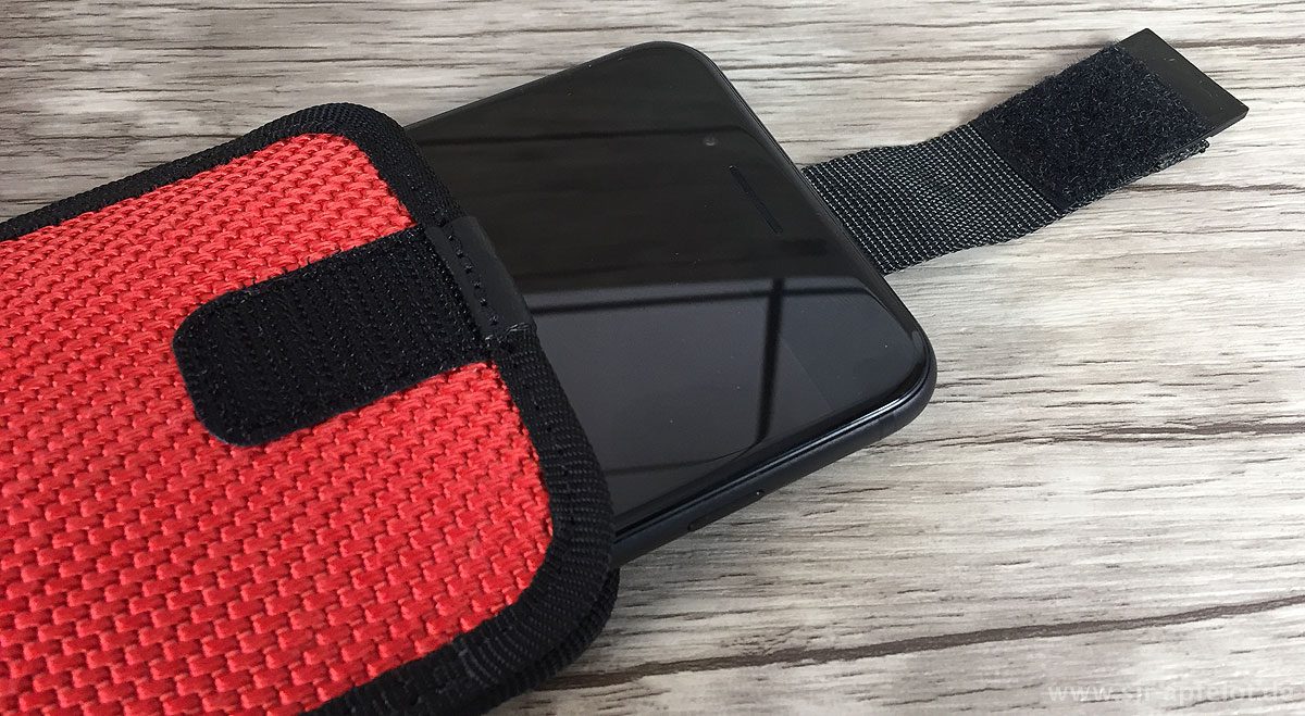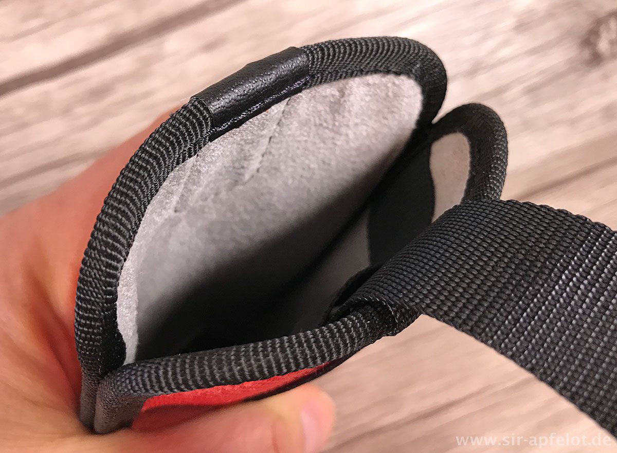 Die Tatsache, dass das iPhone nur mit etwas Kraftaufwand in die Handyhülle einzuschieben ist, mag manche stören, aber es hat auch einen großen Vorteil: Selbst wenn man den Klettverschluss der iPhone-Hülle nicht geschlossen hat, fällt das Smartphone nicht aus der Hüle raus. Ich kann die Handyhülle auf den Kopf drehen und schütteln – aber mein iPhone 7 Plus sitzt fest und rutscht nicht raus.