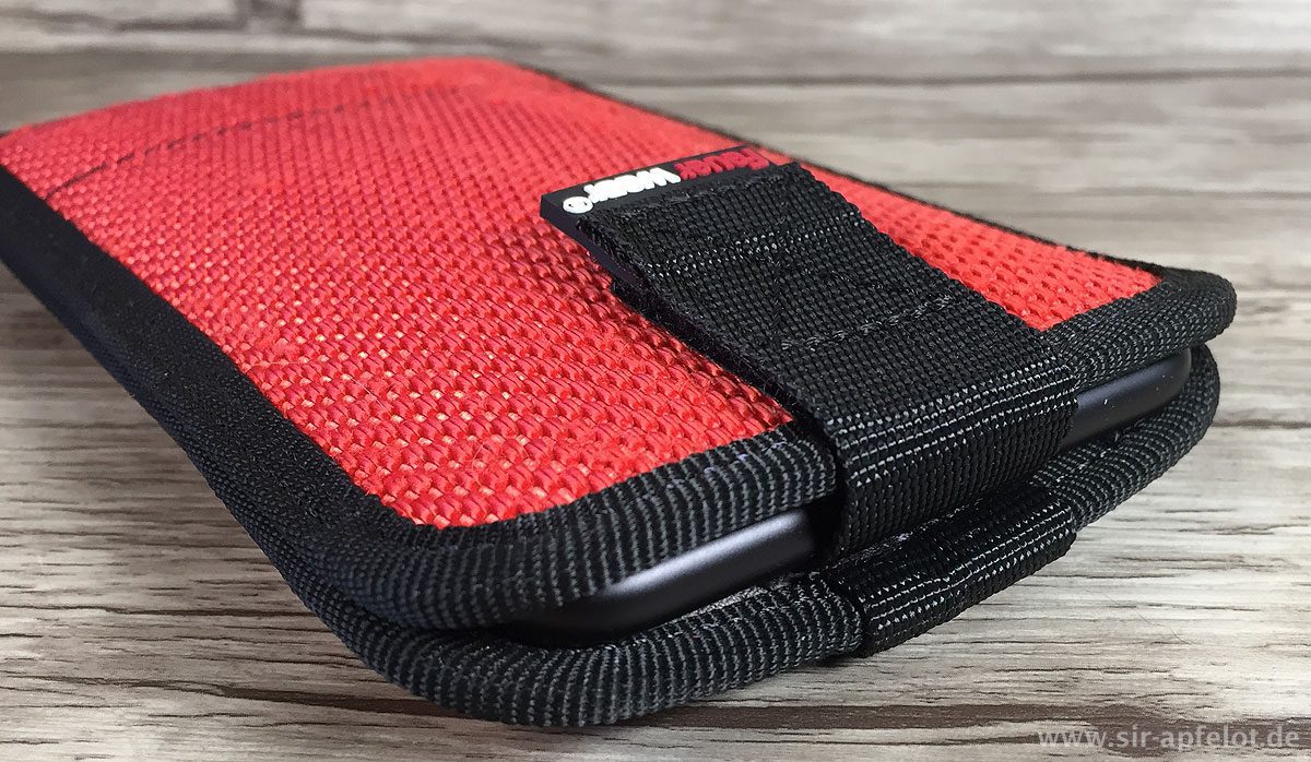 In der Praxis ist der Kletterverschluß als Sicherung über dem iPhone (siehe rechtes Foto oben), so dass ein versehentliches Rausrutschen vermieden wird. Gleichzeitig dient das Sicherungsband dazu, um mit einem leichten Zug das iPhone ein Stück aus der Hülle zu befördern, so dass man es mit den Fingern greifen und komplett rausziehen kann.