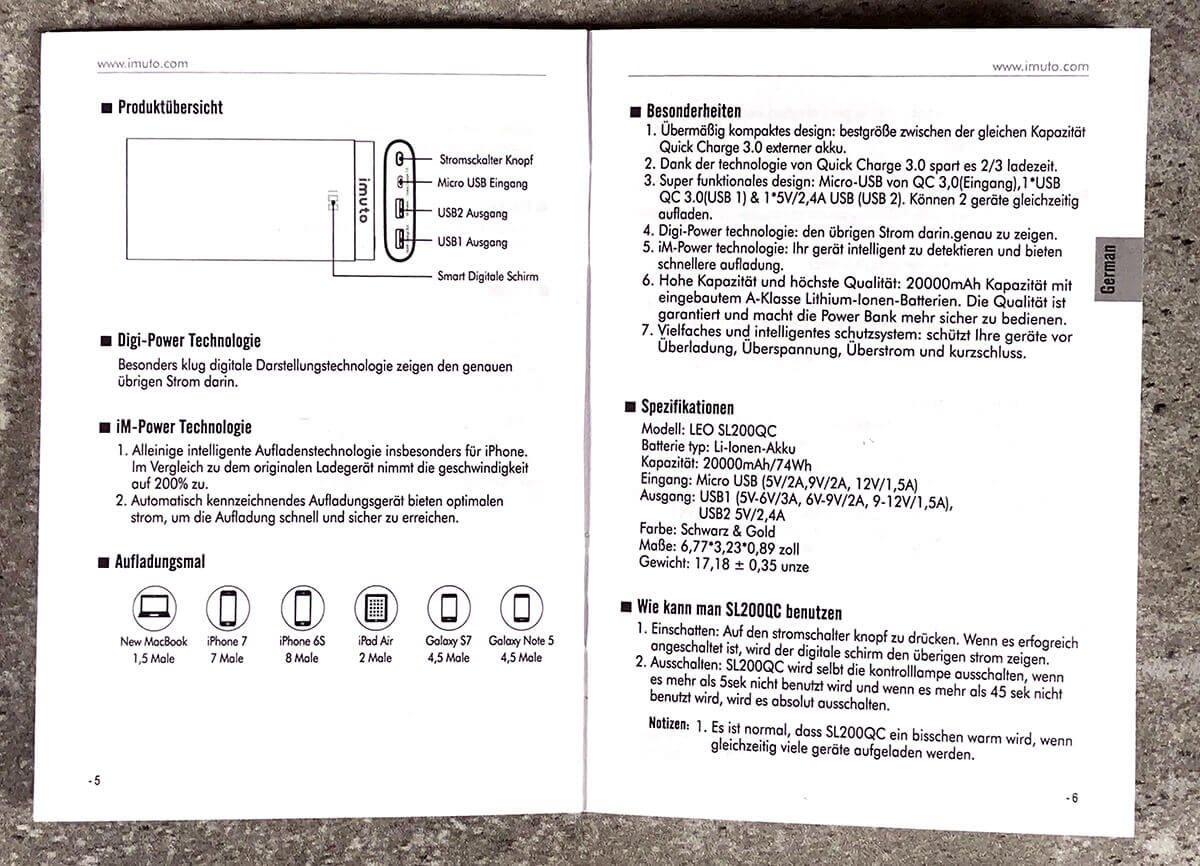 Naja, zum Glück sind Powerbanks nicht so wahnsinnig komplex in der Bedienung, so dass ich hier garnicht drüber meckern möchte. Die Jungs und Mädels bei iMuto können sicher besser Deutsch als ich Chinesisch…