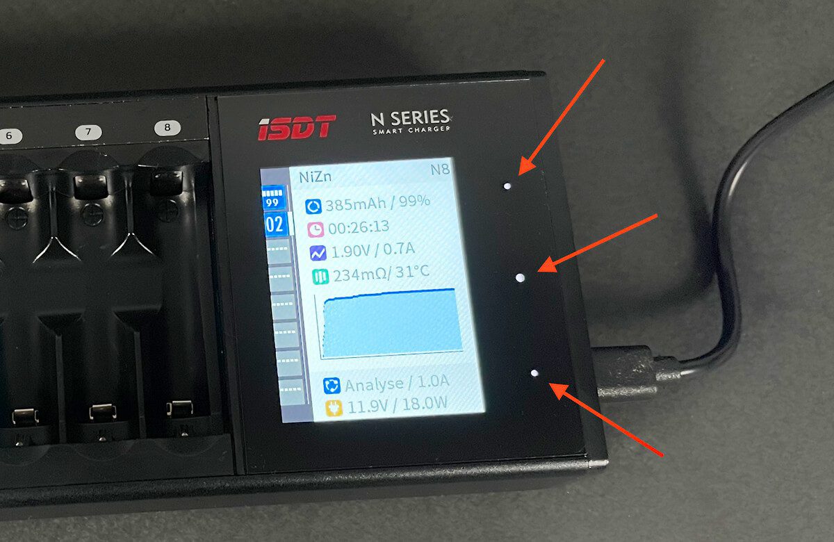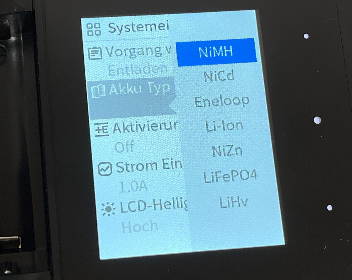 Laut der technischen Beschreibung hat das ISDT N8 eine automatische Erkennung des Akkutyps und sollte diesen dann auch im Display anzeigen. Laut Beschreibung funktioniert diese Erkennung NICHT bei NiZn und LiHV Akkus. Ich habe aus Mangel an weiteren Akkutypen dann mal Eneloops und NiMH Akkus eingelegt, aber hier hat er immer NiMH gewählt, was ja im Prinzip richtig ist. Aber automatische Erkennung, die bei einer Akku-Sorte nicht funktioniert, ist nur halb-praktisch.