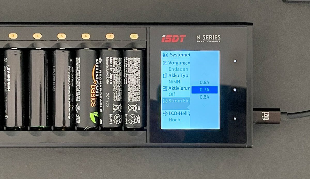 Erstaunlicherweise hat das ISDT N8 über mein gutes CableTex USB C Kabel (ausgelegt bis 10W USB PD) das Netzteil nicht erkennt und bliebt einfach dunkel. Erst, als ich das Kabel gegen ein Tizi Flip USB C Kabel getauscht habe, sprang das Ladegerät an. Nach einigen Stunden waren dann die Akkus geleert und mein eigentlicher Test konnte starten.