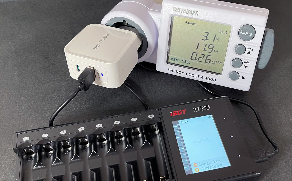 Über die Leistung des Netzteils konnte ich erst einmal nichts sagen, da ich nicht wusste, wieviel Power das ISDT N8 tatsächlich nutzt, wenn man 8 AA Zellen gleichzeitig auflädt. Also habe ich erst einmal acht meiner AA NiMH-Akkus zum Entladen in das Ladegerät gepackt und mein dickes Hunda 150 Watt USB-C-Netzteil dran gehängt (man weiß ja nie!).