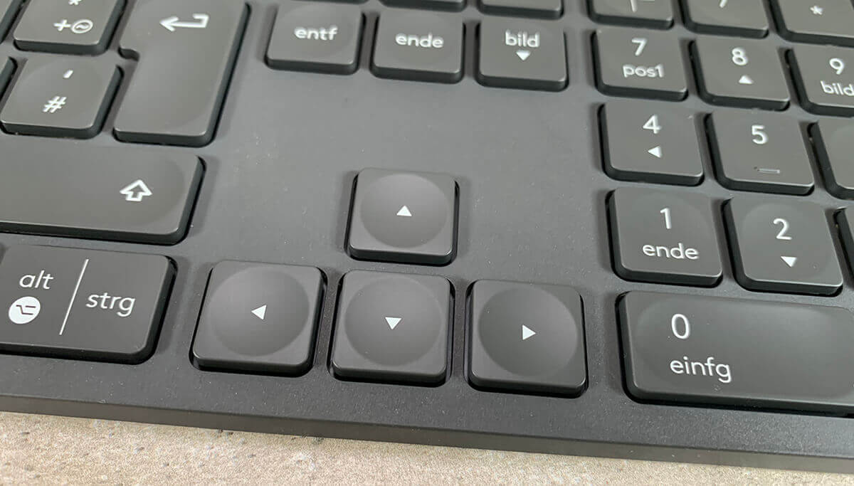 Die Tasten selbst haben noch eine kleine, runde Vertiefung in der Mitte, was hilft, die Finger sauber zu platzieren. Die Sondertasten findet man ebenfalls leicht wieder und ich muss sagen, dass ich den Cursorblock angenehmer finde, als bei der Apple Tastatur.