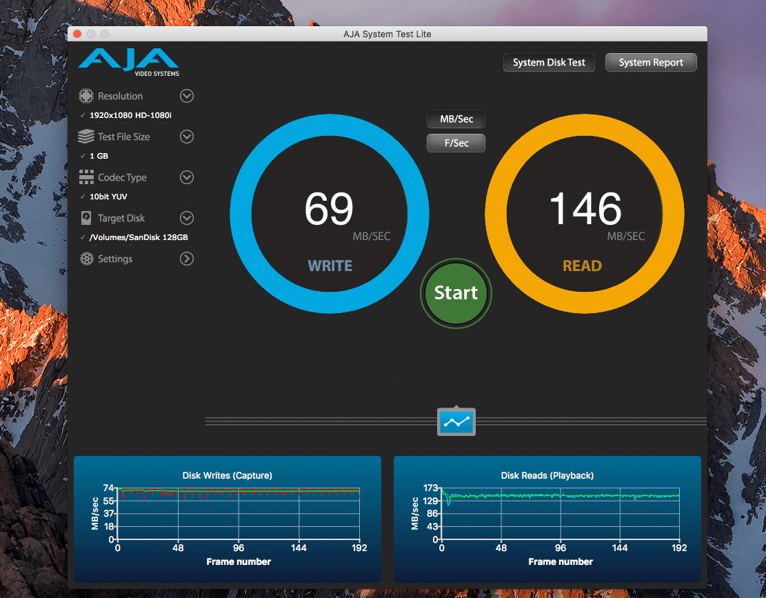 In der Produktbeschreibung wirbt SanDisk für den Stick mit einer Lesegeschwindigkeit von bis zu 150 MB pro Sekunde. In der Praxis ist das bei mir durchaus ein Wert, den man nachvollziehen lassen kann. Meine Lesegeschwindigkeit liegt im Durchschnitt mit 145 MB/sec nur wenige MB unter dem beworbenen Wert. Getestet habe ich den Datendurchsatz mit dem Tool fürs Festplatten-Benchmarking namens AJA System Test, mit dem man aber auch alle anderen Speichermedien prüfen kann.