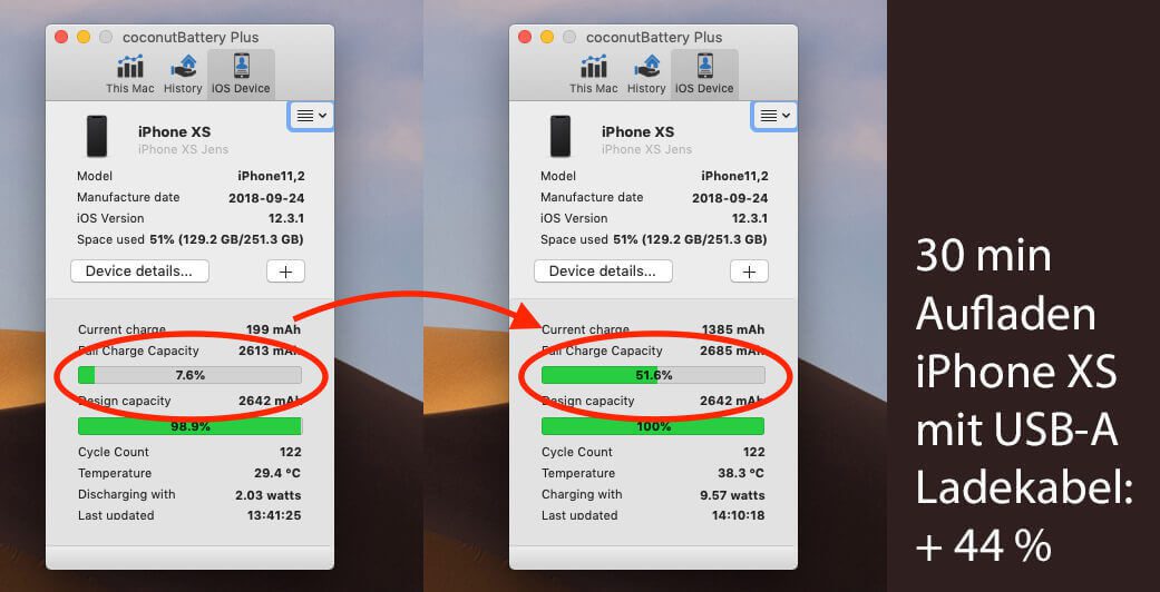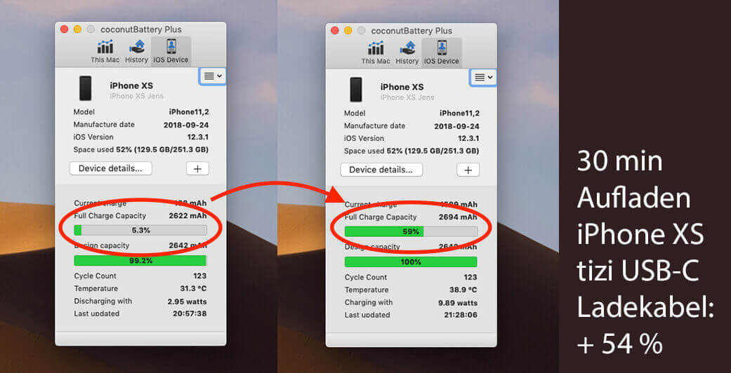Die Messungen habe ich mit meinem iPhone XS vorgenommen. Die Ladeleistung habe ich nicht mit einem USB-C-Multimeter gemessen, sondern direkt mit der App Coconut Battery. Ich denke, damit bekommt man die besten Werte, da diese App genau zeigt, mit welcher elektrischen Leistung der iPhone-Akku gerade geladen wird.