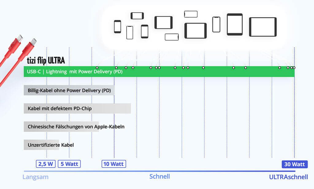 Tizi möchte mit einem Schaubild mit beispielhaften Werten zeigen, wie unterschiedlich die Ladegeschwindigkeit und -leistung alleine durch die Verwendung von verschiedenen USB-C-auf-Lightning-Kabeln sein können.