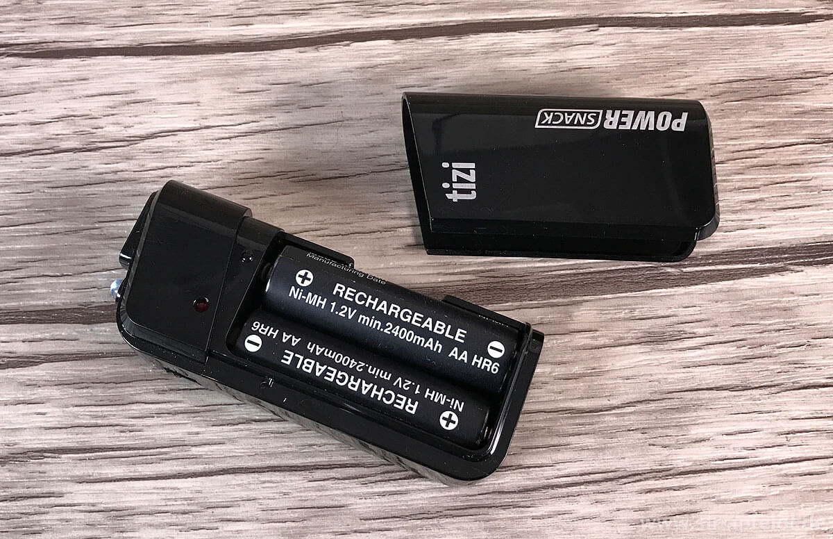 Zum Laden kann man den tizi PowerSnack allerdings auch mit Akkus betreiben. Ich habe dazu die schwarzen Amazon Basic NiMH-Zellen genutzt, die etwas weniger Kapazität haben als die silberne Version. Entsprechend kann es sein, dass man mit Einweg-Batterien eventuell den Ladevorgang beschleunigen kann. Aber Einweg-Batterien kommen für mich einfach nicht in Frage.