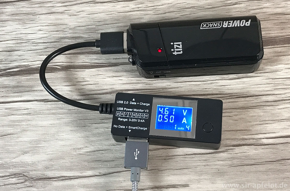 Aber wie gesagt: Das Laden an meinem iPhone 7 Plus hat funktioniert. Equinux selbst schreibt in der Produktbeschreibung, dass man ca. 15% der Smartphone-Akkus mit dem Akku-Pack wieder auffüllen kann. Das kann durchaus sein, da die eingelegten AA-Akkus zwar ca. 2.400 mAh haben, aber natürlich keine 5 Volt Ausgangsspannung liefern. Der tizi PowerSnack muss also die Spannung erhöhen, was entsprechend weniger Stromabgabe bedeutet (elektrische Leistung = Spannung * Strom). Dennoch – und das finde ich sehr positiv – hat mein iPhone mit 0,5 A geladen – auch wenn die Spannung von 4,6 Volt statt den üblichen 5 Volt eher grenzwertig ist (was vermutlich an dem Akku-Betrieb liegt). Zum Vergleich: An meinem Apple Netzteil lädt es meistens mit ca. 1 Ampere und 5 Volt Spannung.
