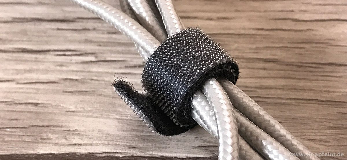 Um das Ladekabel auch wieder gut zu verstauen, wenn es mal nicht benötigt wird, sind am Kabel zwei (entfernbare) Klett-Kabelbinder integriert. Damit kann man die 2-Meter Kabellänge auch bei Bedarf verkürzen oder das Kabel komplett zu einem kleinen Bündel verpacken.