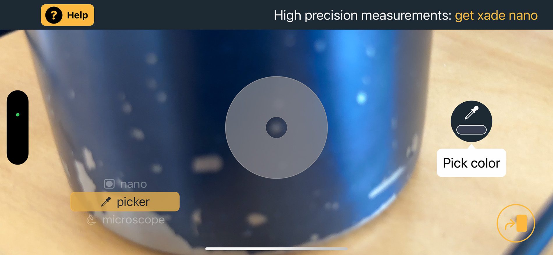 Man kann mit der xade finder App auch ohne den xade nano weniger genaue Farbmessungen durchführen, indem man in der App den Modus "picker" wählt.