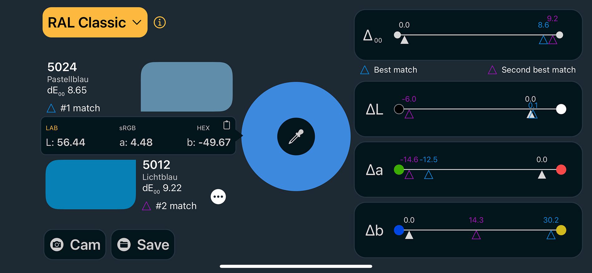 Als Besonderheit kann man auch eigene Farbpaletten anlegen und darin Farbtöne speichern. Misst man nun eine Farbe und wählt eine eigene Farbpalette, so zeigt die App zwei Farben, die am besten zu der gemessenen Farbe passen.