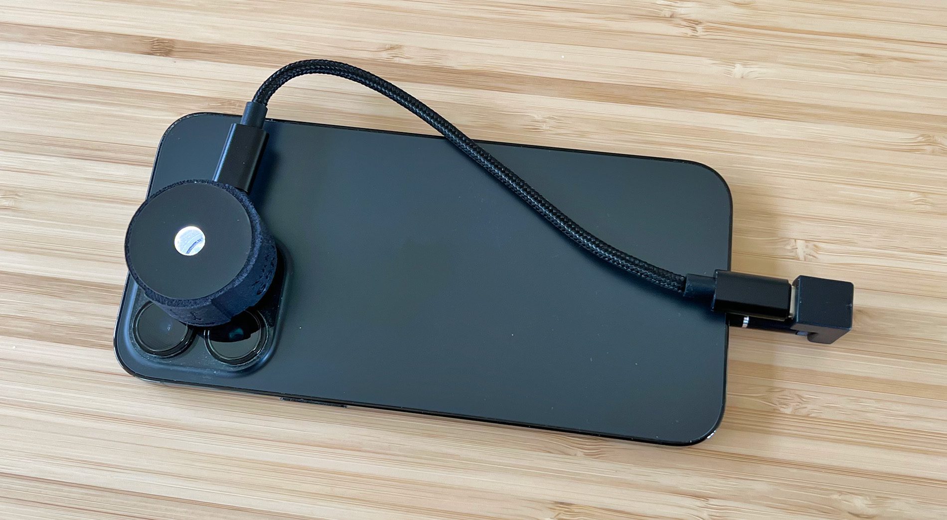 Über ein USB-C-auf-Lightning-Kabel wird das iPhone mit dem xade nano verbunden, um die Lichtquelle mit Strom zu versorgen.