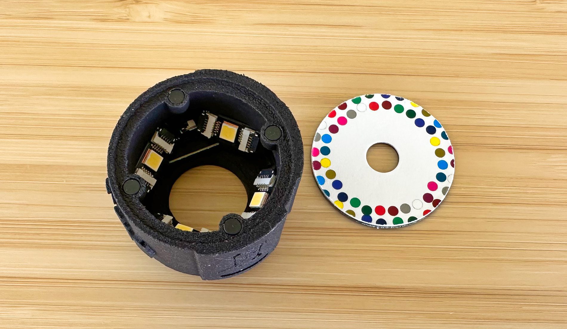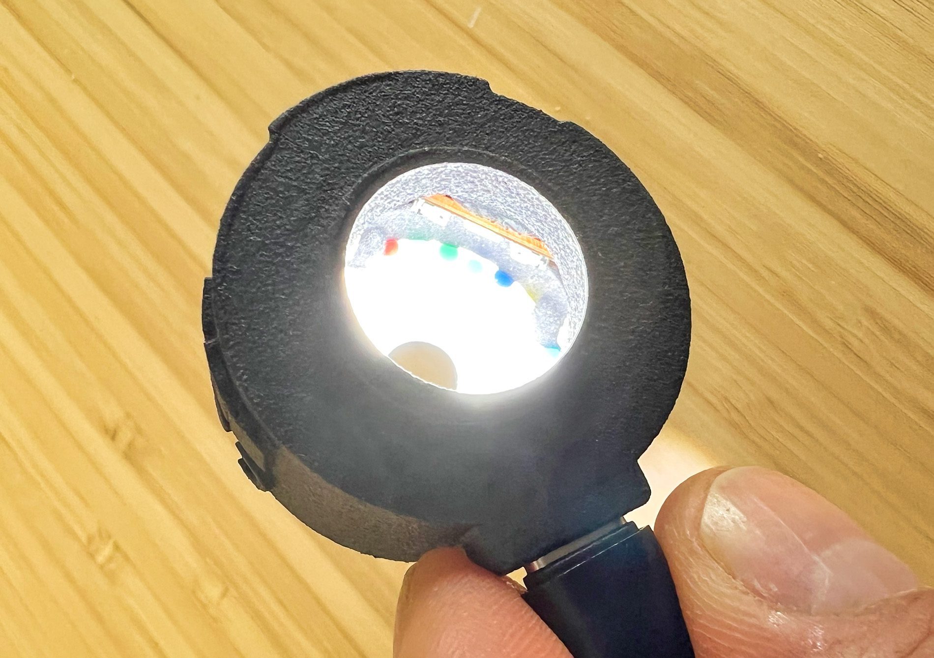 Im Innenraum des xade nano ist noch eine LED-Beleuchtung verbaut, welche die zu messende Farbfläche beleuchtet. Auf der Unterseite des Gerätes ist eine kleine Platte mit Loch in der Mitte befestigt, welche diverse Farbpunkte am Rand enthält. Soweit ich es verstanden habe, werden diese Farbpunkte bei jeder Aufnahme mit erfasst und sozusagen als Farbkarte für die Kalibrierung verwendet.