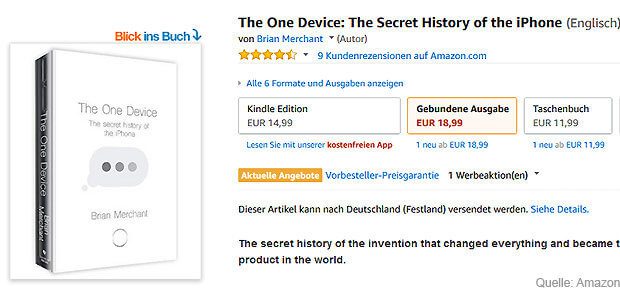 Das Buch The One Device: The Secret History of the iPhone kann jetzt schon bei Amazon vorbestellt werden. Es gibt auch schon Bewertungen, die von der US-amerikanischen .com-Seite übernommen wurden. Von 9 Rezensionen haben 7 Bewertungen 5 Sterne und 1 Bewertung hat 4 Sterne. Bei der einzelnen 1-Stern-Bewertung handelt es sich nicht um einen verifizierten Kauf. Wenn ihr das Buch von Brian Merchant bestellen wollt, habt ihr vier Auswahlmöglichkeiten: