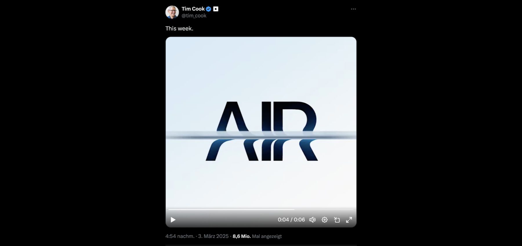 „This week.“, also „Diese Woche.“, lautet der Text des Beitrags auf dem X-Profil von Apples CEO Tim Cook. Darunter gibt es ein sechssekündiges Video, mit der Texteinblendung „There’s something in the AIR“ („Es liegt was in der LUFT“).