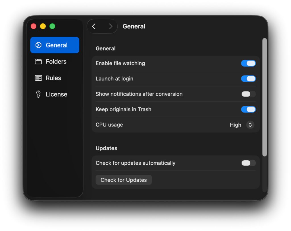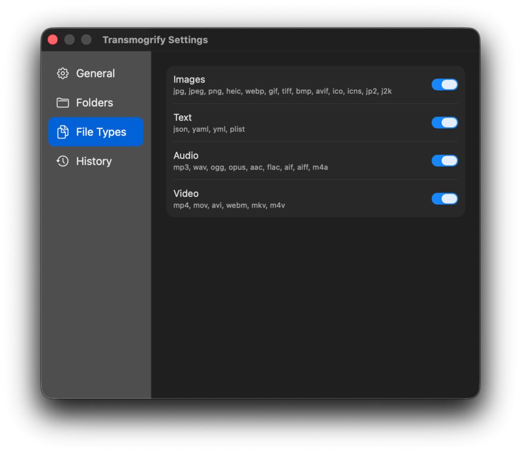 Unterstützt werden laut der offiziellen Formatübersicht u. a. diese Formate und Dateiendungen sowie deren Konvertierung untereinander: ARW, AVIF, BMP, CR2, DNG, GIF, HEIC, ICO, JPG, NEF, ORF, PEF, PNG, PSD, RAF, RW2, TIFF, WEBP, AAC, AIFF, ALAC, CAF, FLAC, M4A, MP3, OFF, OPUS, AVI, MKV, MP4, MPEG, MXF, TS, VOB, WEBM, DOC, DOCX, RTF, 7Z, GZ, TAR, AZW3, EPUB, MOBI, JSON, PLIST, YAML, ZIP, und mehr.