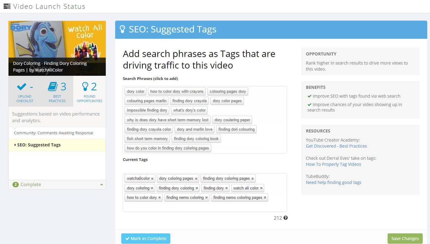 Unter anderem mit einer Keyword-Recherche hilft TubeBuddy schon vor dem Upload eines Videos dabei, die richtigen Schlagworte für die Überschrift, die Beschreibung und die Tags zu finden. Eigene Titel können auf ihre Eignung hin untersucht und angepasst werden. Für das Hochladen von Videos gibt es ebenfalls eine Hilfestellung, welche die für diesen Schritt nötige Zeit halbieren soll. Ein hochgeladenes Video kann zudem angepasst und in seinen Parametern verbessert werden. So erscheint es weiter oben in bestimmten Suchergebnissen.