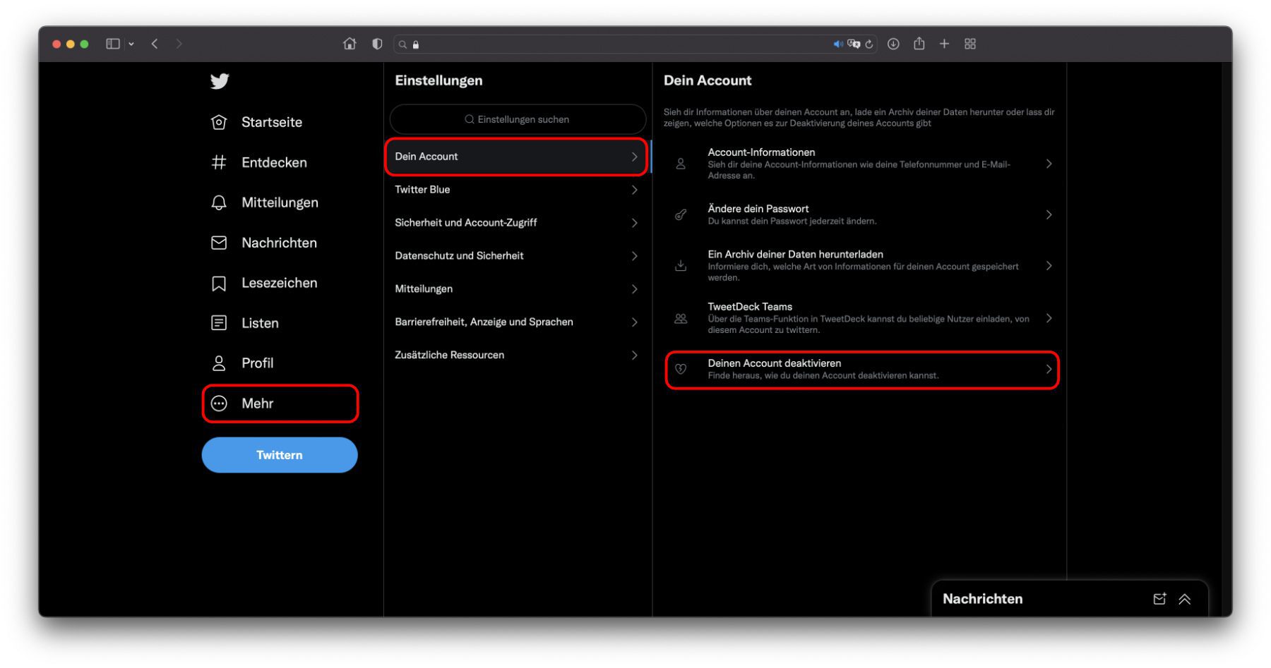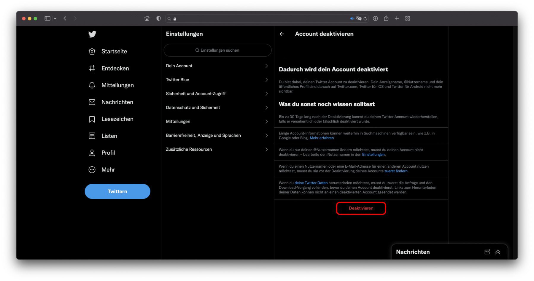 Twitter-Account deaktivieren und löschen (Webseite)
